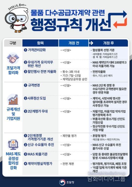 시민행정신문 강갑수 기자 | 조달청은 조달 가격의 신뢰성을 높이고, 공공조달에 남아 있는 불합리한 규제를 혁파하기 위해 '물품 다수공급자계약 관련 행정규칙 2종'을 개정하여 2026년 1월 5일부터 시행했다고 밝혔다.