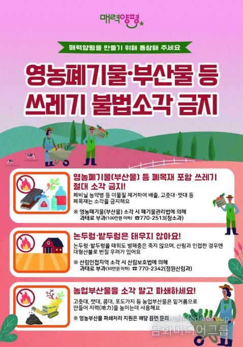 시민행정신문 강갑수 기자 | 양평군은 봄철을 맞아 대기오염 방지와 산불 예방을 위해 영농부산물 및 폐기물 불법소각에 대한 집중 단속 계획을 수립하고, 본격적인 단속에 나선다고 13일 밝혔다.