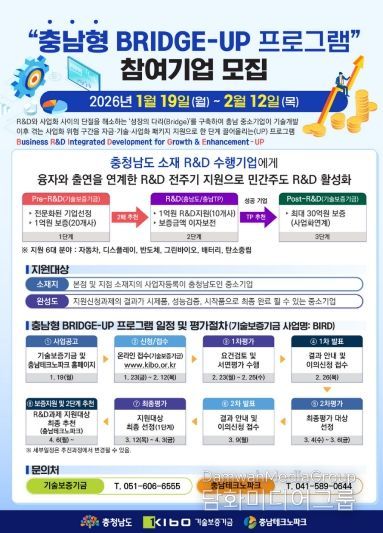 지원 분야는 자동차·디스플레이·반도체·그린바이오·배터리·탄소중립 등 6대 산업군으로, 오는 19일 관련 공고를 내고 기술보증기금 누리집(충남형 BIRD 프로그램)을 통해 2월 12일까지 신청받을 예정이다.