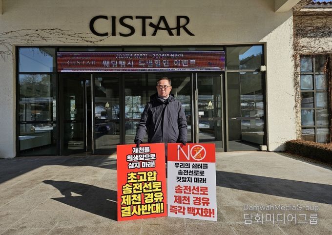 시민행정신문 강갑수 기자 | 제천 신평창-신원주 송전선로 건설사업 반대추진위원회 신창준 위원장은 지난 14일 영월 동강시스타에서 열린 제5차 입지선정위원회 회의장 앞에서 1인 시위를 벌이고, 송전선로 건설계획 중단과 입지 선정 절차의 전면 재검토를 강력히 촉구했다.