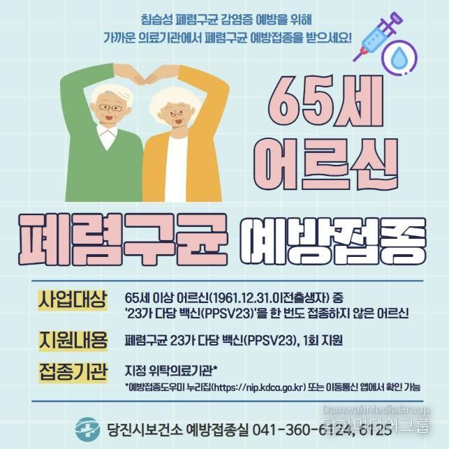 당진시보건소 관계자는 “폐렴구균 예방접종은 고령층의 감염병 예방과 중증화 방지를 위한 핵심적인 공공보건 정책”이라며 “어르신들의 건강 보호를 위해 무료 예방접종을 지속적으로 추진하고 있는 만큼, 대상자분들의 적극적인 참여를 부탁드린다”고 당부했다.