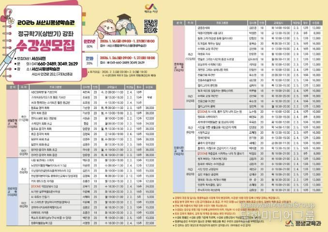 성기영 서산시 평생교육과장은 “급변하는 시대에 AI 기술이 필수 능력이 되는 만큼, 시민들이 필요로 하는 주제로 배움의 자리를 마련했다”라며 “새로운 배움으로 시대를 앞서가는 기쁨을 누릴 수 있도록 많은 관심과 참여를 부탁드린다”라고 말했다.