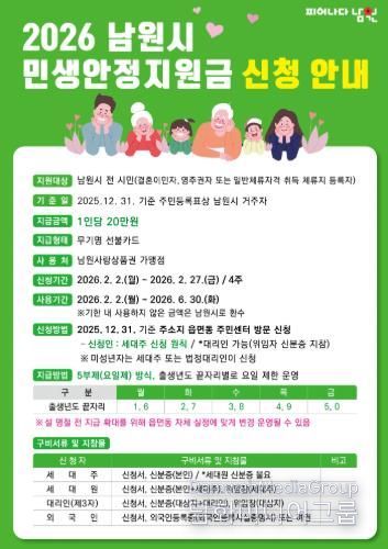 한편, 남원시는 2025년 1월에도 1인당 30만 원, 총 230억 원 규모의 민생안정지원금을 전액 시비로 편성해 지급한 바 있다.