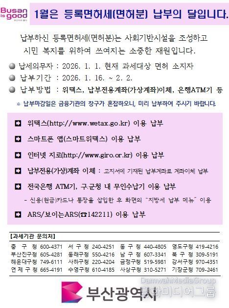 시민행정신문 강갑수 기자 | 부산시는 2026년 정기분 등록면허세(면허분) 총 43만여 건, 142억 원을 부과했다고 밝혔다.