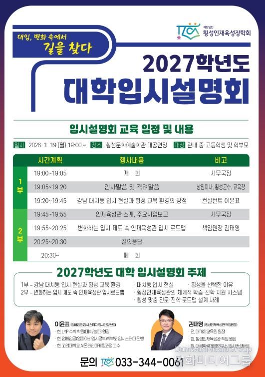 시민행정신문 강갑수 기자 | (재)횡성인재육성장학회는 오는 1월 19일 오후 7시, 횡성문화예술회관에서 관내 중·고등학생과 학부모를 대상으로 ‘2027학년도 대학입시설명회’를 개최한다고 밝혔다.