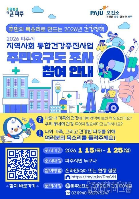 시민행정신문 기자 | 파주시는 시민의 건강한 삶을 지원하기 위해 '2026년 지역사회 통합건강증진사업’추진에 앞서 주민건강요구도 조사를 실시한다.