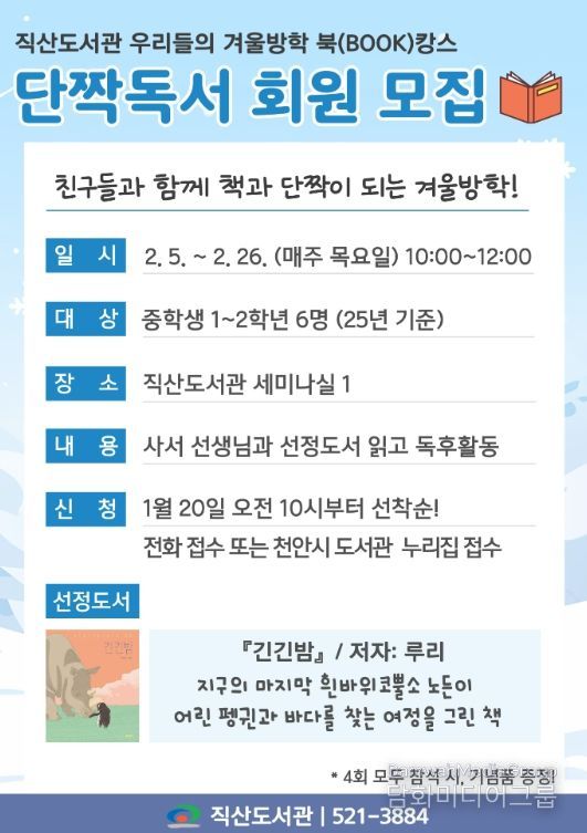 직산도서관 관계자는 “청소년들이 겨울방학 독서동아리 활동을 통해 성장하는 시간을 보내길 바란다”고 말했다.