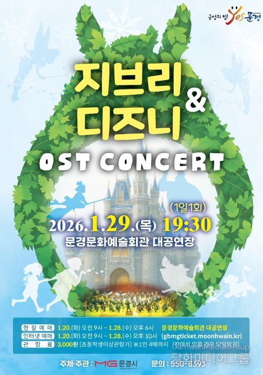 시민행정신문 강갑수 기자 | 문경문화예술회관에서는 신년 겨울 방학을 맞아 인기 애니메이션 대표곡들을 들려주는 지브리 ·디즈니 OST 콘서트 공연을 1월 29일 19:30 (1일 1회)에 문경문화예술회관 대공연장에서 개최한다.