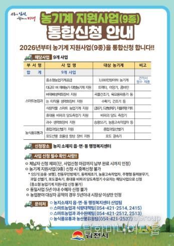 시민행정신문 강갑수 기자 | 김천시는 지역 농업인을 대상으로 ‘2026년 농기계 지원사업(9종)’ 신청을 오는 2026년 1월 30일(금)까지 농지소재지 읍면동 행정복지센터에서 접수한다고 밝혔다.
