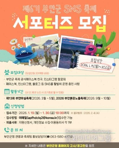 시민행정신문 강갑수 기자 | 부안군은 오는 19일부터 30일까지 부안의 대표 축제를 홍보할 제6기 부안군 SNS 축제 서포터즈’를 모집한다.