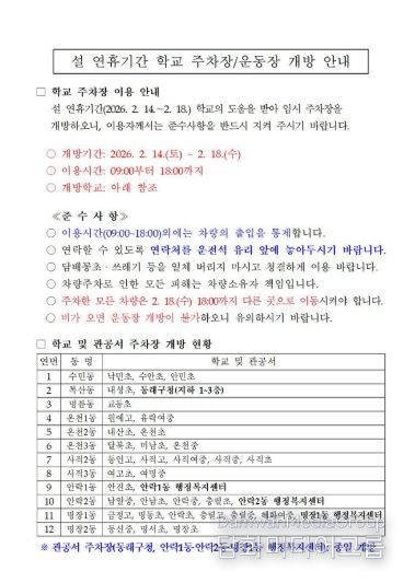 연휴 기간 동안 관공서 주차장은 종일 개방되며, 학교 주차장은 오전 9시부터 오후 6시까지 이용할 수 있다. 다만, 우천 시 운동장은 개방하지 않는다.