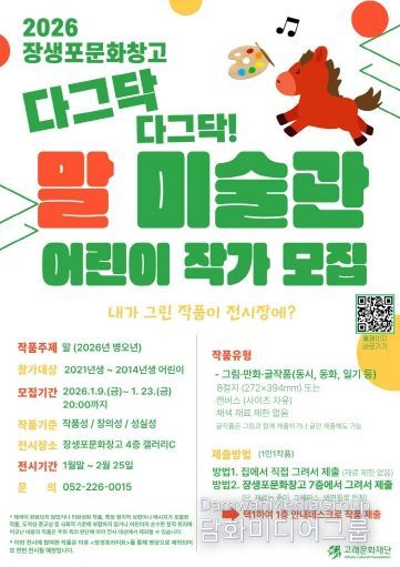 시민행정신문 기자 | 고래문화재단에서 관리하는 장생포문화창고는 2026년 병오년 ‘붉은 말의 해’를 맞아 어린이가 직접 전시의 주체가 되는 참여형 미술 전시 ‘다그닥 다그닥! 말 미술관 – 아이들 상상 속 말 친구들-’을 오는 1월 24일부터 2월 25일까지 장생포문화창고 4층 전관에서 개최한다.