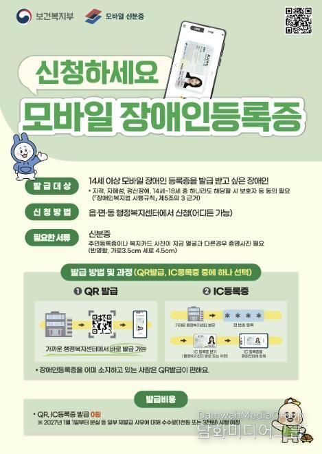 이유진 장애인복지과장은 “모바일 장애인등록증 도입으로 장애인의 행정 서비스 접근성이 한층 향상될 것으로 기대된다”며 “디지털 기술을 통해 장애인의 생활 편의를 실질적으로 개선할 수 있도록 제도가 안정적으로 정착되도록 최선을 다하겠다”고 말했다.
