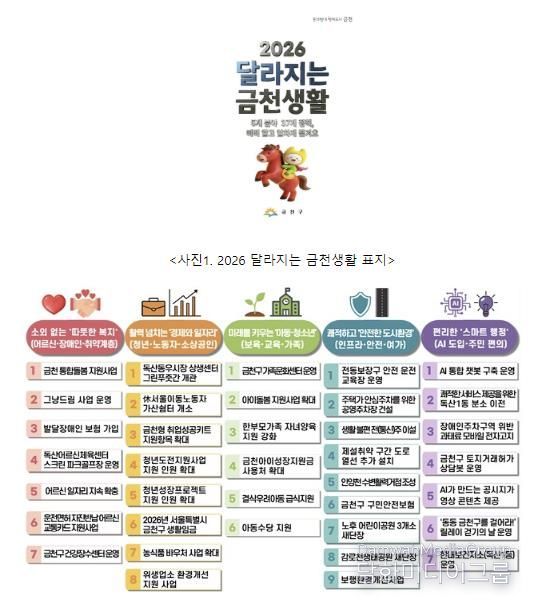 구는 이번 2026 달라지는 금천생활에 지역주민들이 일상생활에서 직접 체감할 수 있는 변화를 중심으로 37개 정책을 담았다. ▲복지(7개) ▲경제·일자리(8개) ▲아동·청소년(6개) ▲안전·도시환경(9개) ▲행정(7개) 등 5개 분야다.