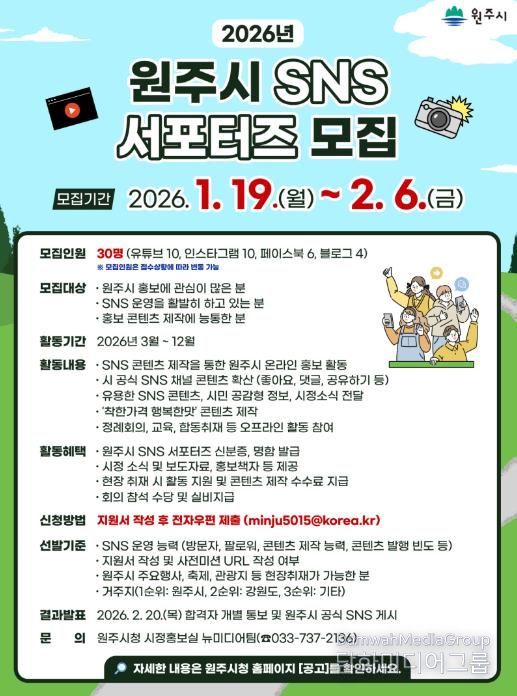 시민행정신문 강갑수 기자 | 원주시는 참신한 아이디어와 열정을 가진 ‘2026년 원주시 SNS 서포터즈’를 다음 달 6일까지 모집한다.
