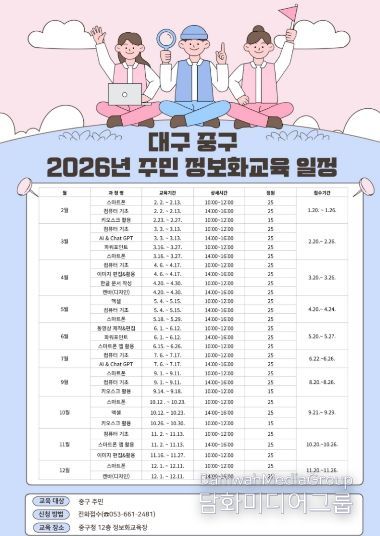 류규하 중구청장은 “디지털 환경 변화에 따라 행정과 일상에서 요구되는 정보 활용 능력도 점점 높아지고 있다”며 “기초 교육부터 최신 기술까지 아우르는 주민 정보화교육을 통해 구민 누구나 디지털 환경에 능동적으로 대응할 수 있도록 지원하겠다”고 말했다.