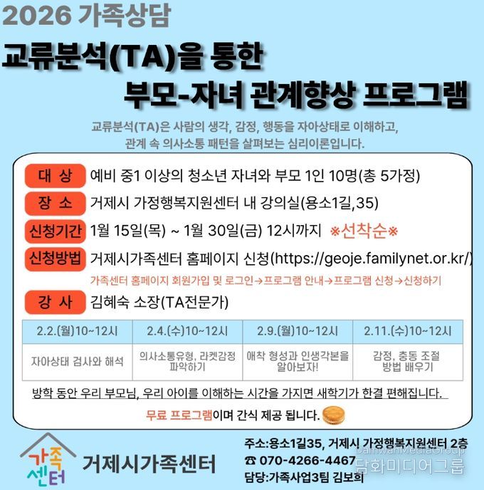 시민행정신문 강갑수 기자 | 거제시가족센터는 오는 2일부터 진행하는'교류분석(TA)을 통한 부모–자녀 집단상담 프로그램' 참여자를 모집한다고 밝혔다.