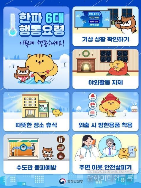 가용매체를 총동원하여 기상 정보 확인, 외출 자제, 외출 시 목도리 착용, 수도관 동파 예방조치 등 한파 대비 국민행동요령을 전파한다.