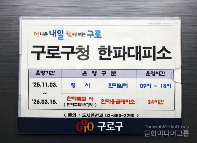 한파쉼터 및 응급대피소 위치와 운영시간 등 자세한 사항은 구로구 누리집과 누리소통망(SNS)을 통해 확인할 수 있으며, 문의는 도시안전과로 하면 된다.