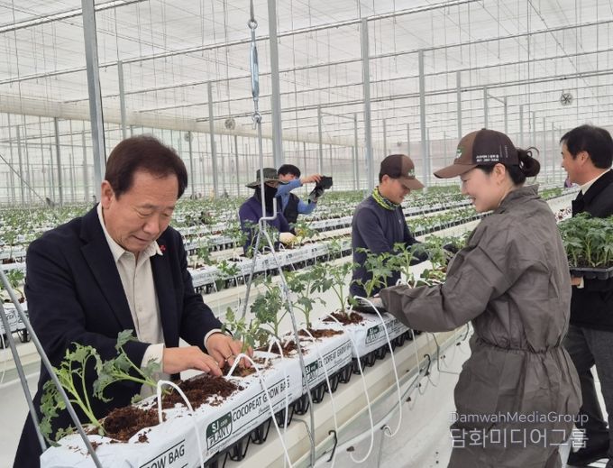 이날 토마토 정식행사에는 박현국 군수와 농업기술센터 관계자를 비롯한 입주 청년농업인과 가족들이 참여한 가운데 임대형 스마트팜 B동에 서양계 토마토 ‘데프니스(Dafnis)' 2만 6,000주를 처음으로 정식했다.