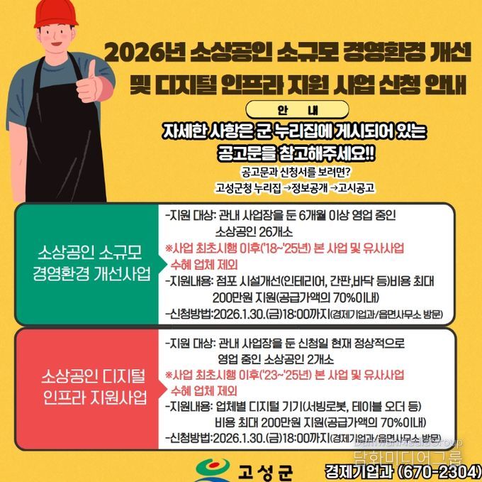시민행정신문 이세훈 기자 | 고성군은 물가 상승과 경기 침체로 경영 부담이 커진 소상공인을 돕기 위해 ‘소상공인 소규모 경영환경 개선지원 사업’과 ‘소상공인 디지털 인프라 지원사업’을 추진한다고 밝혔다.