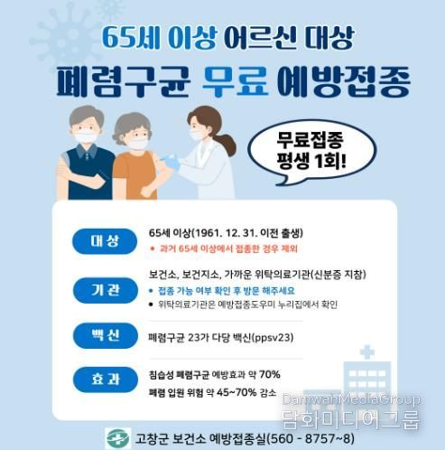 시민행정신문 강갑수 기자 | 고창군보건소가 1961년생 이상 어르신을 대상으로 폐렴구균 예방접종을 무료로 실시한다.