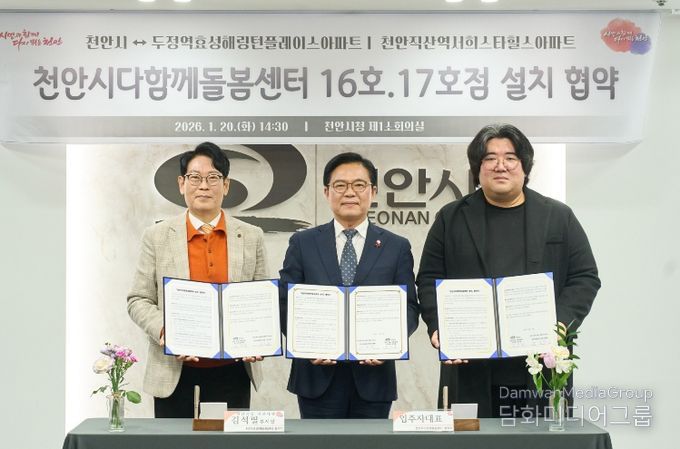시민행정신문 강갑수 기자 | 천안시는 20일 시청 소회의실에서 두정역 효성해링턴플레이스·직산역 서희스타힐스 아파트 입주자대표회의와 ‘다함께돌봄센터 16·17호점 설치를 위한 업무협약’을 체결했다.