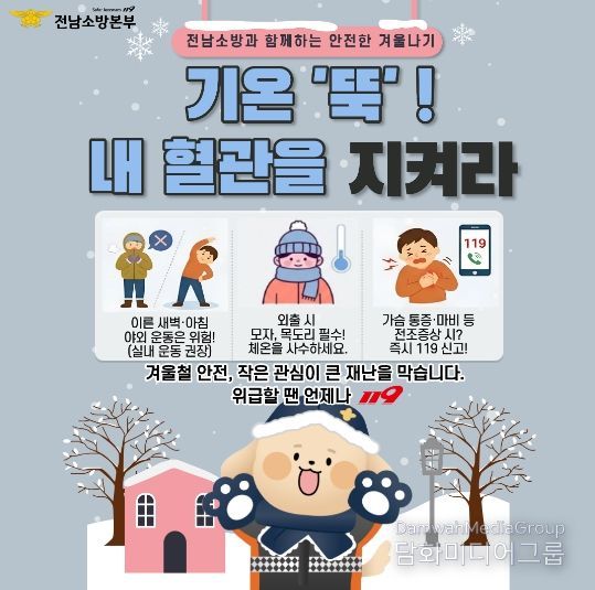 이에 전남소방은 겨울철 순환기계 응급환자 발생에 대비해 구급대원들의 전문 처치 능력을 강화하고, 신속한 이송 체계를 재점검하는 등 '골든타임' 사수에 만전을 기하고 있다.