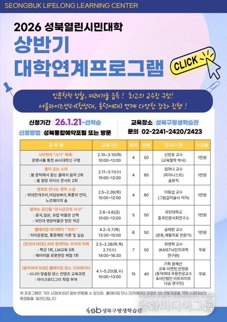 시민행정신문 강갑수 기자 | 서울 성북구가 2월부터 5월까지 구민을 대상으로 ‘2026 상반기 열린시민대학’을 운영한다.
