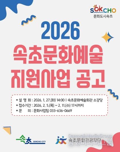 한편, 재단은 문화예술인의 사업 이해도를 높이기 위해 1월 27일 오후 2시 속초문화예술회관 별관 소강당에서 ‘2026 속초문화예술지원사업 설명회’를 연다.