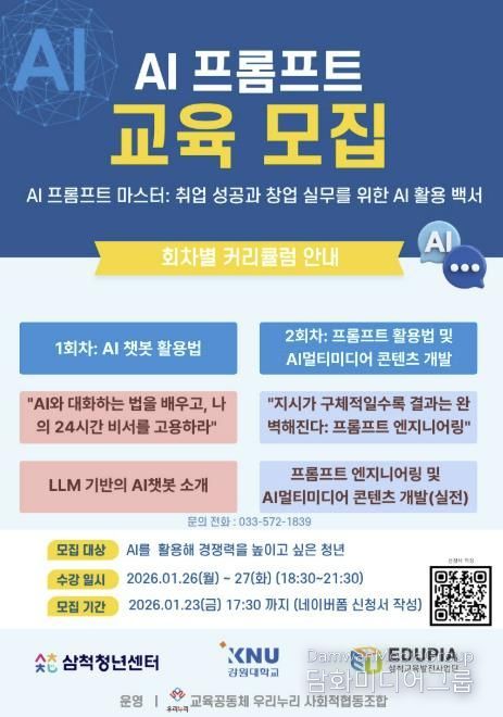 시민행정신문 강갑수 기자 | 삼척청년센터는 삼척교육발전사업단(EDUPIA)와 함께 AI 기술을 활용한 취업·창업 실무 역량 강화를 위해 ‘AI 프롬프트 교육과정’을 개설하고 참여자를 모집한다.