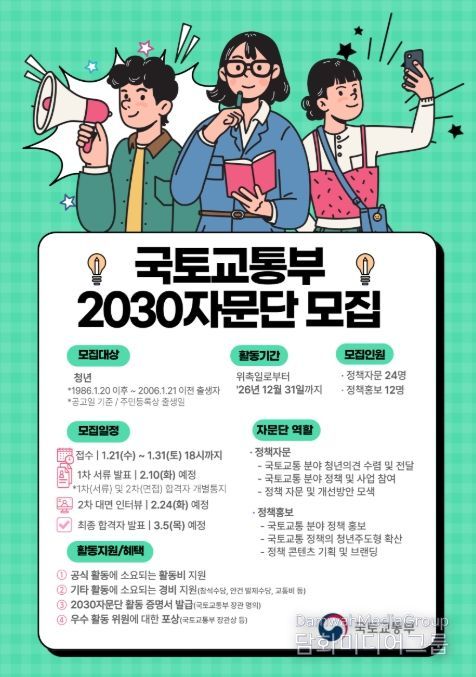 2030 자문단은 국토교통 정책에 관심과 열정을 가진 만 19세에서 39세 이하 청년이라면 누구나 지원할 수 있으며, 서류심사와 면접을 거쳐 최종 36명을 선발할 예정이다.