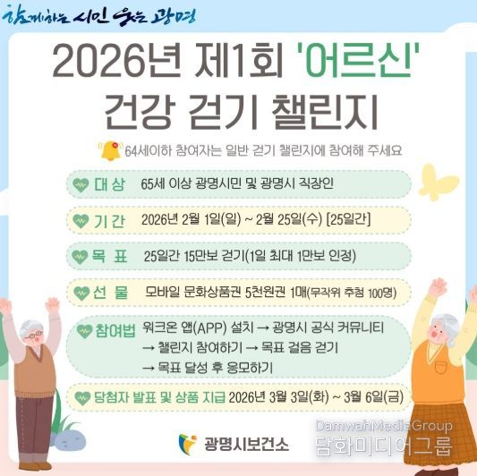 시민행정신문 기자 | 광명시가 오는 2월부터 모바일 걷기 플랫폼 ‘워크온(WalkOn)’을 활용한 걷기 챌린지 방식을 개편하고, 65세 이상 시민을 위한 ‘어르신 걷기 챌린지’를 별도로 운영한다고 21일 밝혔다.