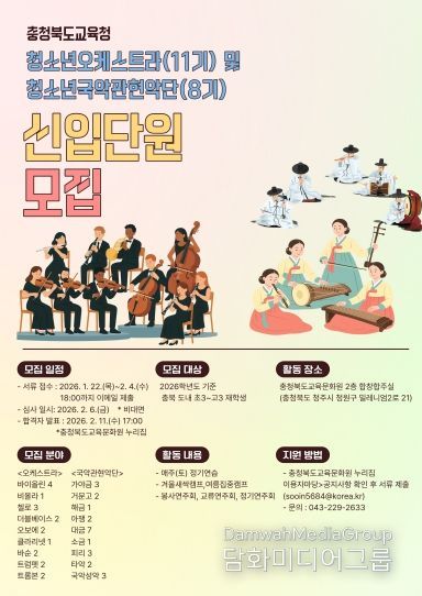시민행정신문 기자 | 충청북도교육청 직속기관 교육문화원은 2026년도 충청북도교육청청소년오케스트라 및 청소년국악관현악단의 신입단원을 모집한다.