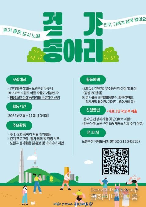 구는 앱과 연계한 걷기동아리 활성화에도 힘을 쏟고 있다. 걷기에 관심 있는 노원구민이라면 누구나, 5인 이상 팀을 구성해 상시 신청할 수 있다. 활동 기간은 2월부터 11월까지 10개월간이다. 동아리는 주 1~2회 자율 걷기 활동과 함께 걷기 좋은 길 홍보, 신규 걷기 코스 제안 등 지역 생활체육의 확산을 위한 활동을 수행한다. 상·하반기 각 2팀씩 총 4팀의 우수 동아리를 선정해 팀별 30만 원을 포상할 예정이다.