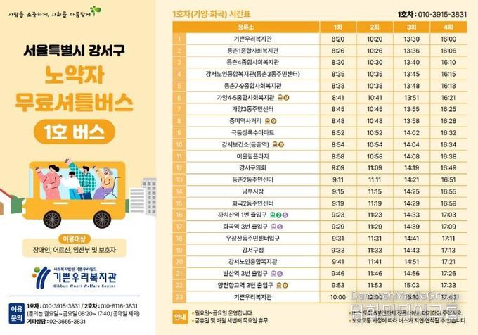 자세한 버스 시간표 및 노선은 강서구청 누리집(복지'장애인복지)에서 확인할 수 있다.