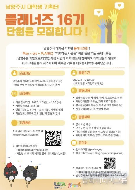 시민행정신문 강갑수 기자 | 남양주시는 관내 거주 대학생을 대상으로 남양주시 대학생 기획단 ‘플래너즈’ 16기 신규 단원을 28일까지 모집한다.