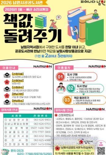 시민행정신문 강갑수 기자 | 남원시는 시민들의 독서 참여를 확대하고 지역서점과의 상생을 도모하기 위해 '2026년 책값 돌려주기 사업'의 지원 규모를 확대해 운영한다고 밝혔다.