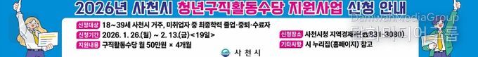 시민행정신문 강갑수 기자 | 사천시는 관내 미취업 청년의 구직활동을 지원하기 위해 ‘2026년 청년구직활동수당 지원사업’ 대상자를 오는 1월 26일부터 2월 13일까지 모집한다.