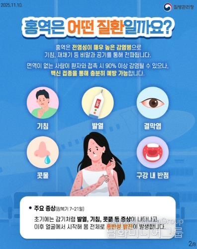 홍역은 기침이나 재채기 등을 통해 공기로 전파되는 감염병으로 같은 공간에 잠시 머무는 것만으로도 감염될 수 있을 만큼 전염력이 매우 높다.