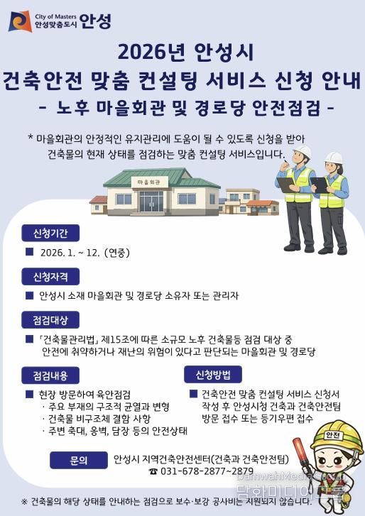 시민행정신문 강갑수 기자 | 안성시는 올해 ‘건축안전 맞춤 컨설팅 서비스(노후 마을회관 및 경로당 안전점검)’를 시행한다고 밝혔다.