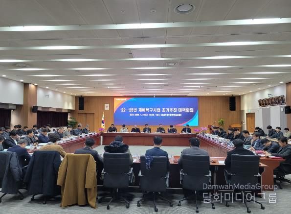 도는 23일 도청 대회의실에서 신일호 안전기획관 주재로, 도 관련 부서 및 시군 과장들이 참석한 가운데 ‘재해복구사업 조기 추진 대책회의’를 개최했다.