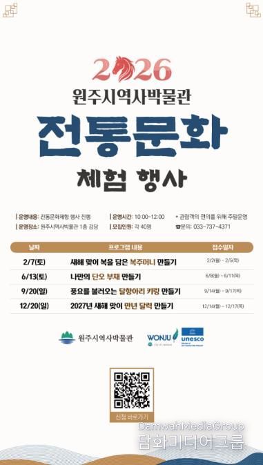 시민행정신문 기자 | 원주시역사박물관은 새해를 맞아 ‘2026 전통문화 체험 행사’를 운영한다.