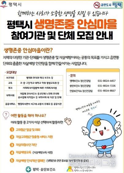 '생명존중 안심마을' 사업에 참여를 희망하는 기관이나 단체는 평택시 정신건강복지센터로 문의하면 된다.