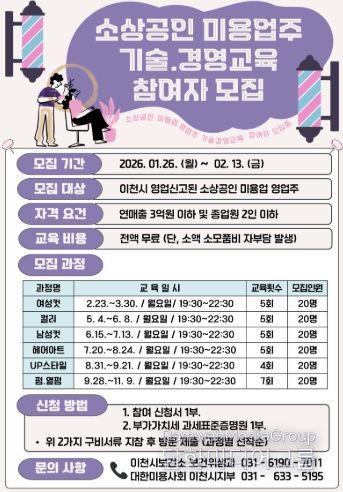 모집 기간은 2026년 1월 26일부터 2월 13일까지이며, 신청은 이천시보건소 보건위생과와 대한미용사회 이천시지부에서 할 수 있다.