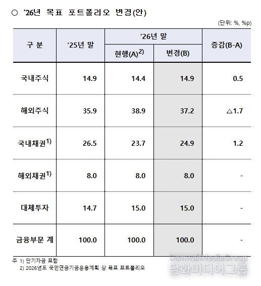 우선 기금위는 기금규모 확대에 따른 외환조달 부담과 최근 수요 우위의 외환시장 환경 등을 고려해 2026년도 기금운용계획상 목표 포트폴리오를 변경하기로 결정했다. 이에 따라 2026년 해외주식 목표비중은 당초 계획인 38.9%에서 37.2%로 조정(△1.7%)되어 당초 계획 대비 절반 이상 축소된다.