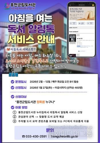시민행정신문 강갑수 기자 | 홍천군립도서관은 2026년 2월부터 군민의 독서 정보 접근성을 높이기 위해 매주 1회 우수 도서를 선별해 요약본을 제공하는 ‘아침을 여는 독서 알림톡’ 서비스를 운영한다.