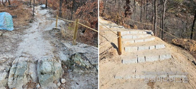 토사 침식이 우려되는 곳과 급경사 암반 지역 등 200m 구간에 폭 2m의 돌계단과 안전난간 및 손잡이를 설치해 등산 보행 안전성을 크게 높였다.