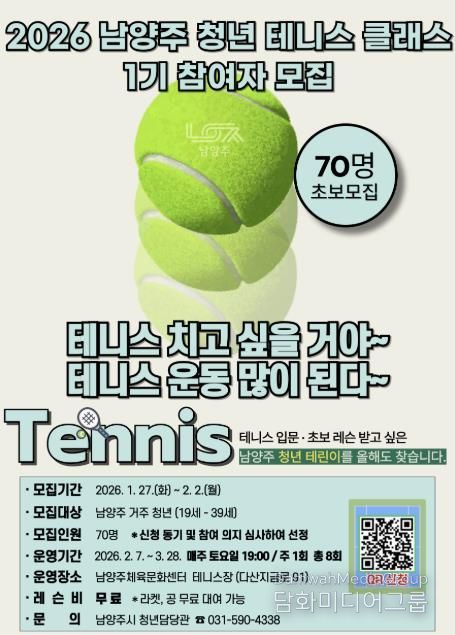 시민행정신문 강갑수 기자 | 남양주시는 27일부터 내달 2일까지 ‘2026 남양주 청년 테니스 클래스 1기’ 참여자를 모집한다고 밝혔다.