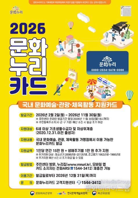 시민행정신문 강갑수 기자 | 세종특별자치시가 내달 2일부터 소외계층의 문화 격차 해소를 위한 2026년도 문화누리카드 발급을 시작한다.